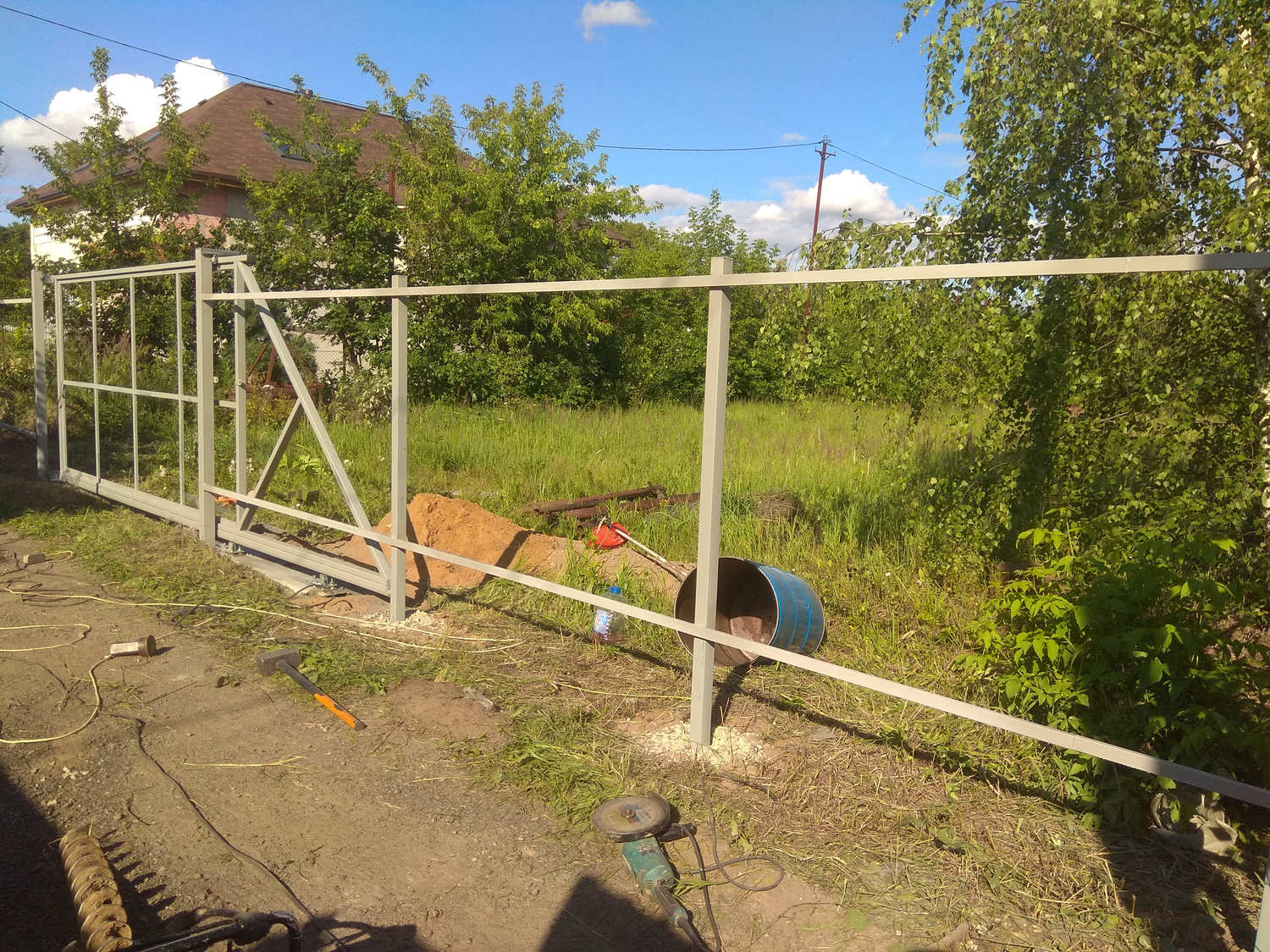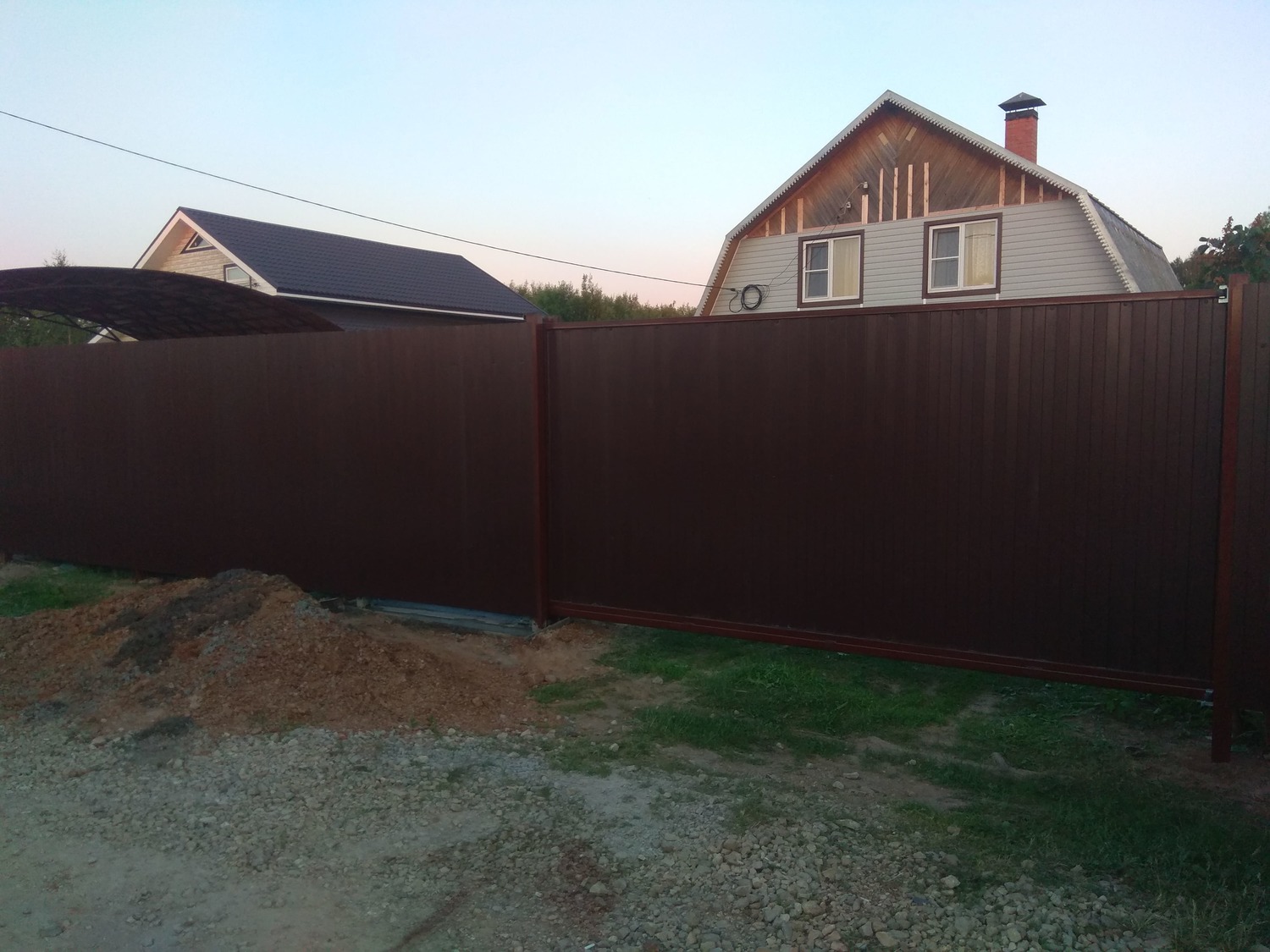 - Материал: Профнастил, металлический штакетник, сетка, проф труба, дерево